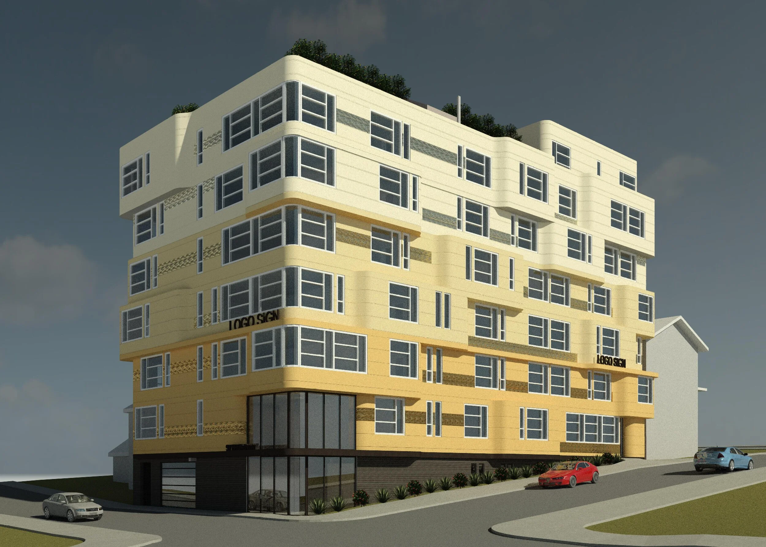 This contemporary six-story residential project includes eighty-six units and a rooftop amenity with a view.